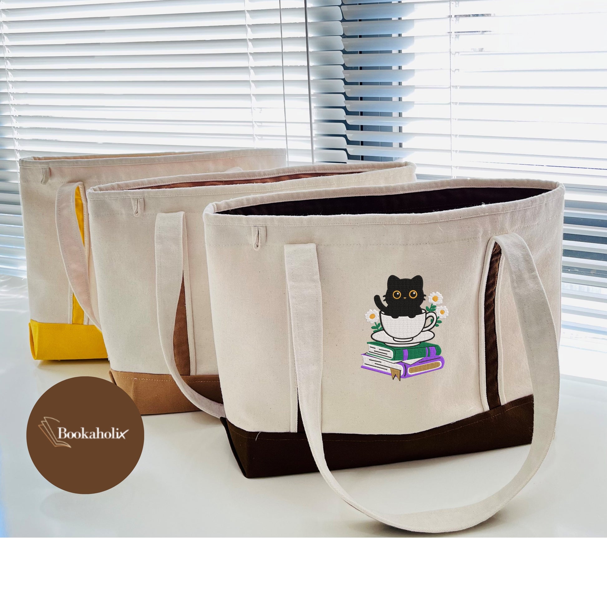 Cute Cat With Coffee And Book Embroidered Tote Bag For Book Lovers